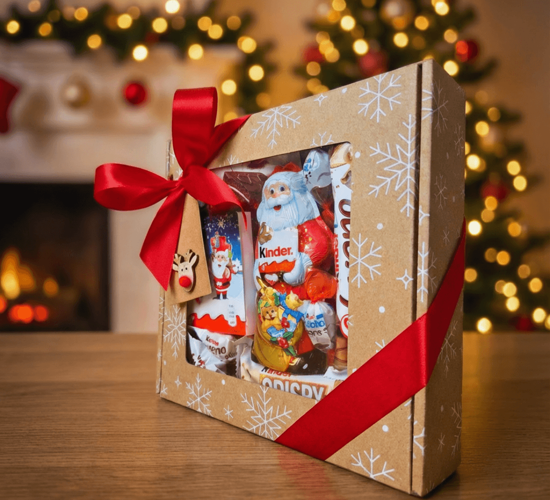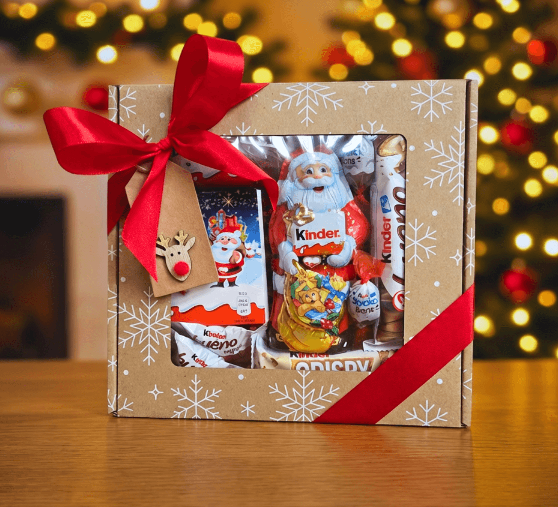 Box Świąteczny Kinder Santa Treats to zimowy zestaw słodyczy dla dzieci w eleganckim pudełku ze śnieżynkami, przewiązany czerwoną wstążką z zawieszką reniferka. Gotowy prezent na Mikołajki i pod choinkę.