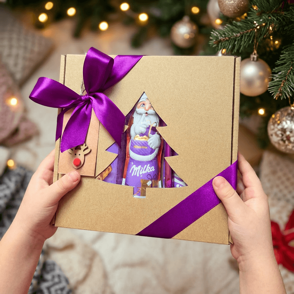 Gotowy świąteczny upominek Milka w pudełku z okienkiem w kształcie choinki, przewiązany fioletową wstążką.
