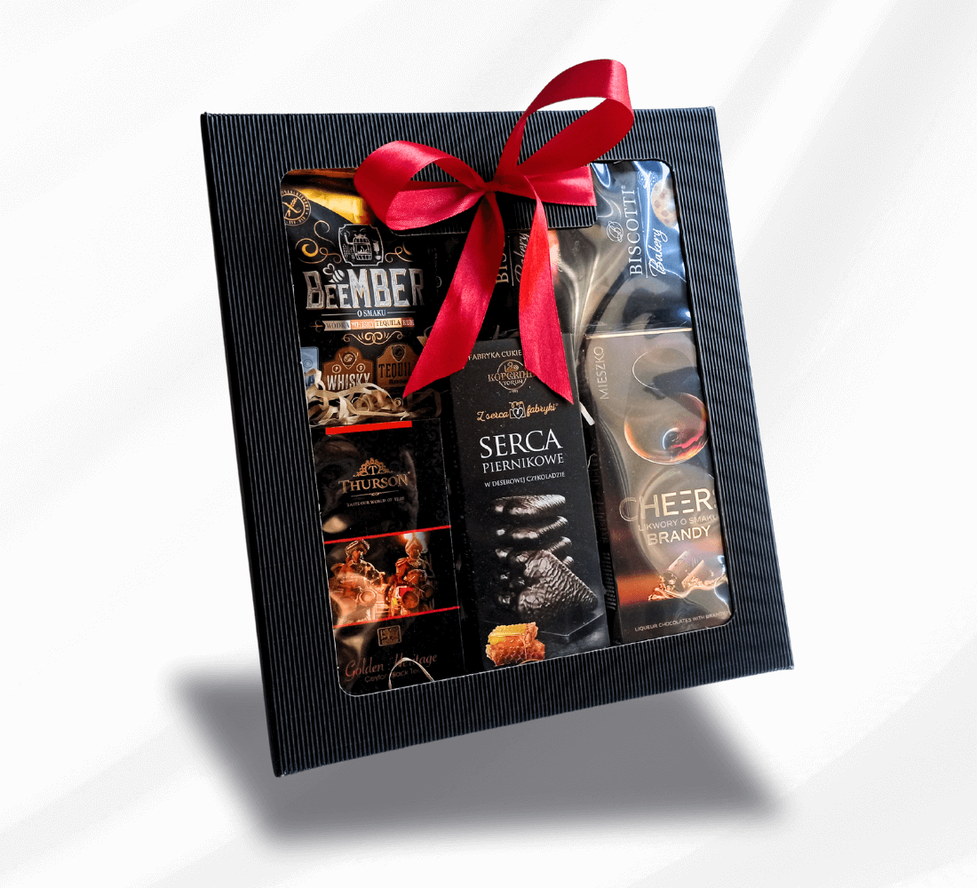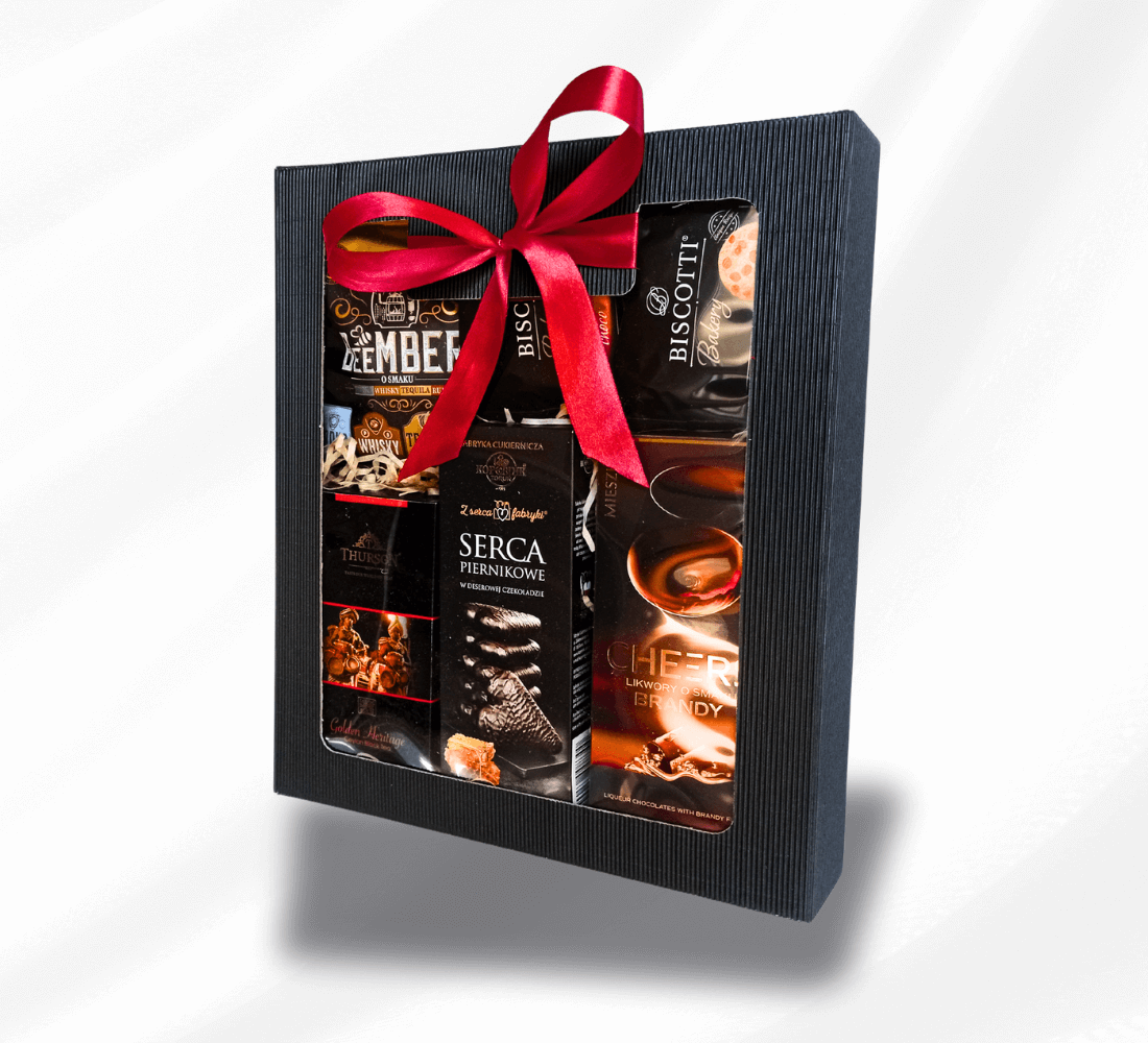 Całość została zapakowana w eleganckie pudełko z okienkiem i ozdobiona czerwoną wstążką – gotowa do wręczenia!