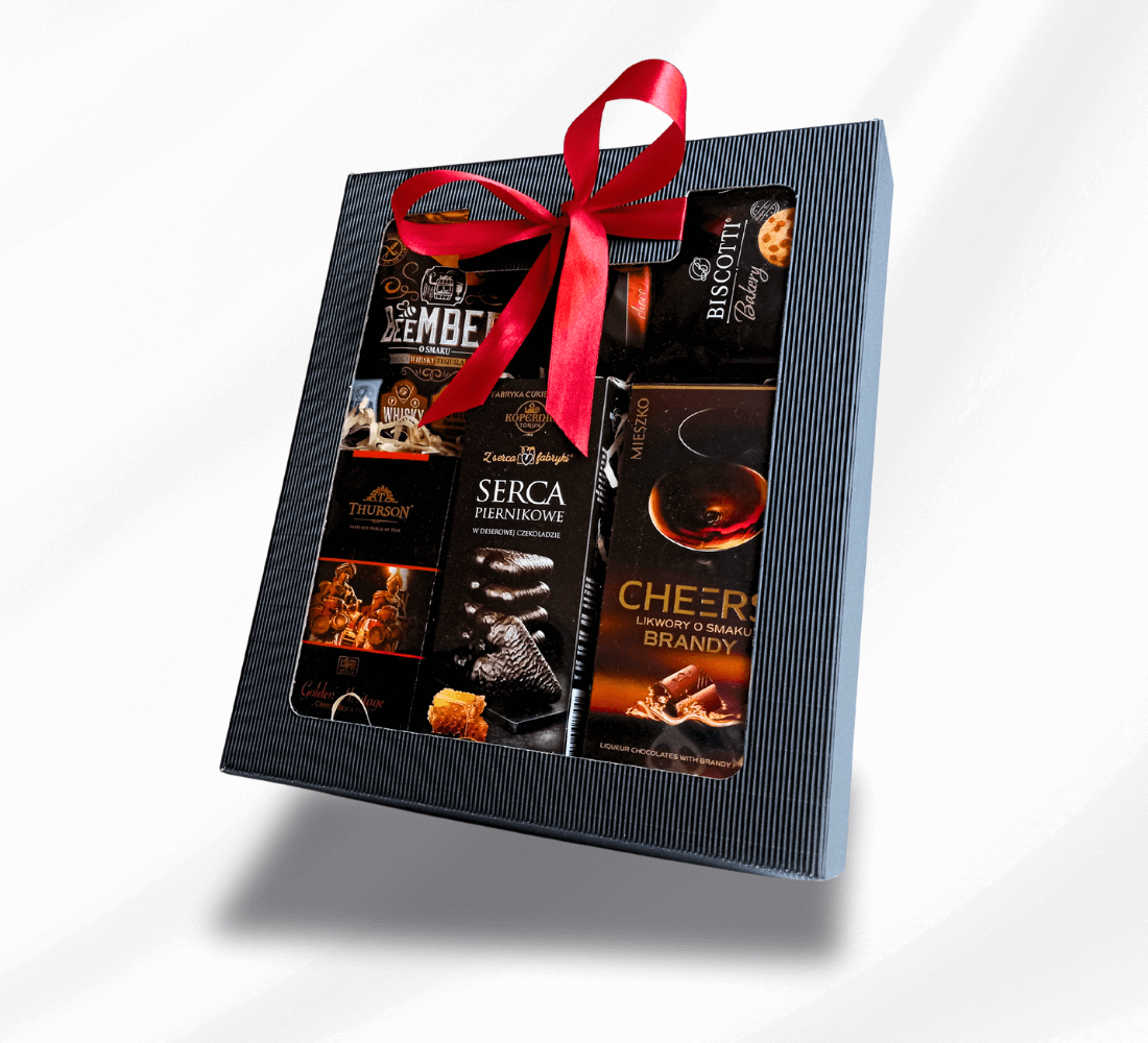 W eleganckim pudełku znajdziesz aromatyczne pierniki w czekoladzie, praliny o smaku popularnych alkoholi, chrupiące biscotti oraz czarną herbatę – wszystko, co potrzebne do słodkiego relaksu.